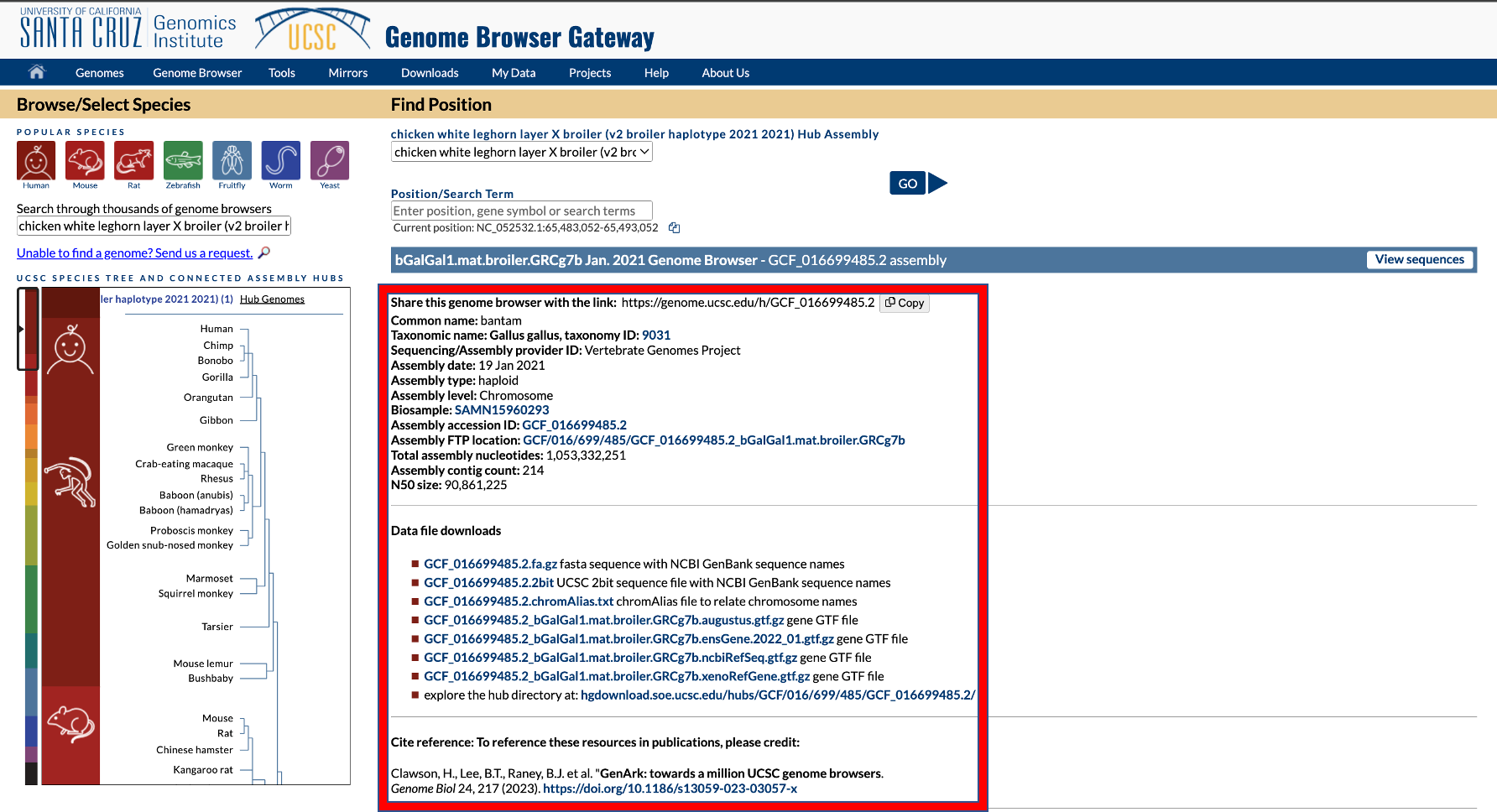 Note: The Species Tree does not include all available Genome Browser assemblies. The process of adding Genome Browsers has been streamlined, enabling rapid releases but omitting certain previous features, such as inclusion in the Species Tree. To find a specific assembly, use the assembly search box.