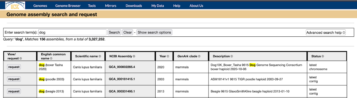 If a desired assembly is not listed, you can request it by clicking "Unable to find a genome? Send us a request". This will direct you to the Genome Assembly Search and Request page.