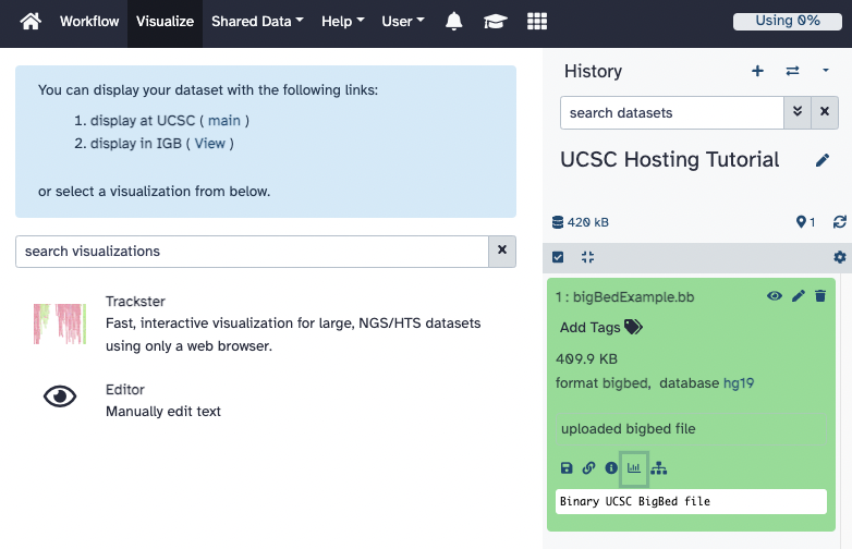 Figshare is a site for researchers and institutions to upload and collect usage statistics on their data, as well as make their data shareable and discoverable. The process for uploading a hub to Figshare is similar to the process involved at CyVerse, where one must first create an account, upload the bigDataUrl files, create shareable links, and then edit your hub.txt, genomes.txt, and trackDb.txt appropriately. One advantage to using Figshare is their emphasis on usage statistics, so institutional accounts can see how often their hubs and tracks are being accessed by others.