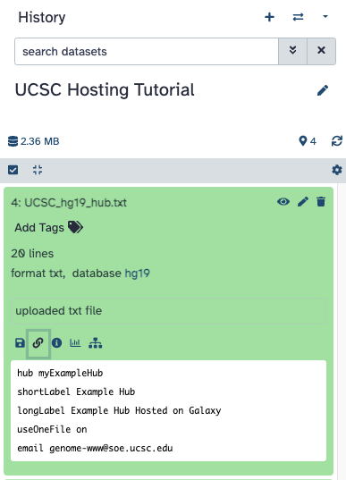 hub myExampleHub shortLabel Example Hub longLabel Example Hub Hosted on Galaxy useOneFile on email genome-www@soe.ucsc.edu genome hg19 track vcfExample shortLabel VCF example longLabel VCF example using Galaxy visibility pack type vcfTabix maxWindowToDraw 200000 bigDataUrl https://usegalaxy.org/api/datasets/f9cad7b01a472135076a05ca3c1069a7/display?to_ext=vcf bigDataIndex https://usegalaxy.org/api/datasets/f9cad7b01a47213595c3df01954cabaf/display?to_ext=binary track bigBedExample shortLabel BigBed example longLabel BigBed example using Galaxy type bigBed visibility pack bigDataUrl https://usegalaxy.org/api/datasets/f9cad7b01a4721358405ebd3fc34f65a/display?to_ext=bigbed