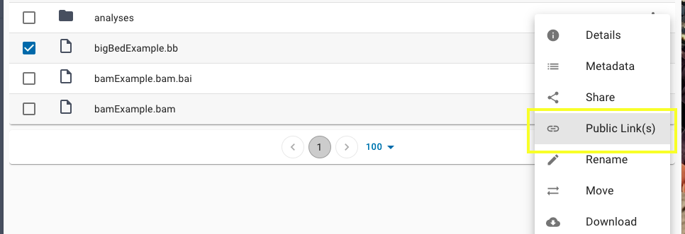 Once your file is available use the three dots on the far right to click the "Public Links(s)" option.