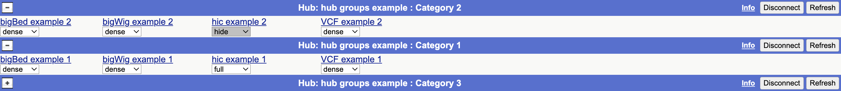 Track hubs are web-accessible directories of genomic data that can be viewed on the UCSC Genome Browser (please note that hosting hub files on HTTP tends to work even better than FTP and local hubs can be displayed on GBiB). Track hubs can be displayed on genomes that UCSC directly supports, or on your own sequence. Hubs are a useful tool for visualizing a large number of genome-wide data sets. For example, a project that has produced several wiggle plots of data can use the hub utility to organize the tracks into composite and super-tracks, making it possible to show the data for a large collection of tissues and experimental conditions in a visually elegant way, similar to how the ENCODE native data tracks are displayed in the browser.