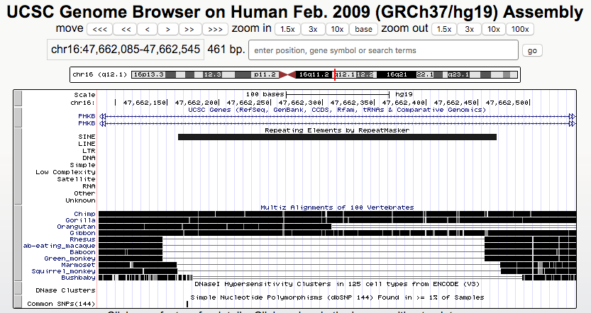 A user was interested in an intron of the gene PHKB where a repeat element for AluY was given. The user could not find the Alu repeat, and the response was to aid the user in turning on the RepeatMasker track where information on repeats, such as the AluY element desired, is contained.