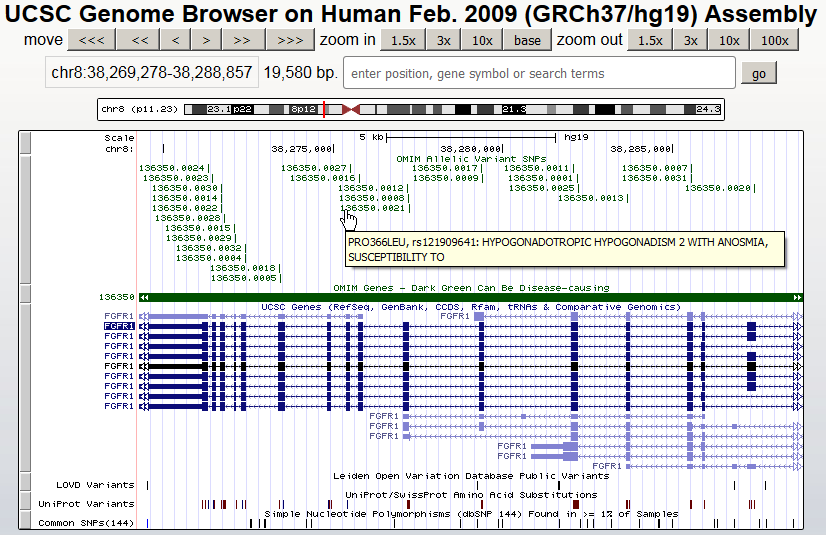 In the above and this zoomed in session you can mouseover OMIM variants to access details such as OMIM Allelic Variant 136350.0021 in the far right to see "PRO366LEU,rs121909641:HYPOGONADOTROPIC HYPOGONADISM 2 WITH ANOSMIA, SUSCEPTIBILITY TO" to learn additional information about each variant.