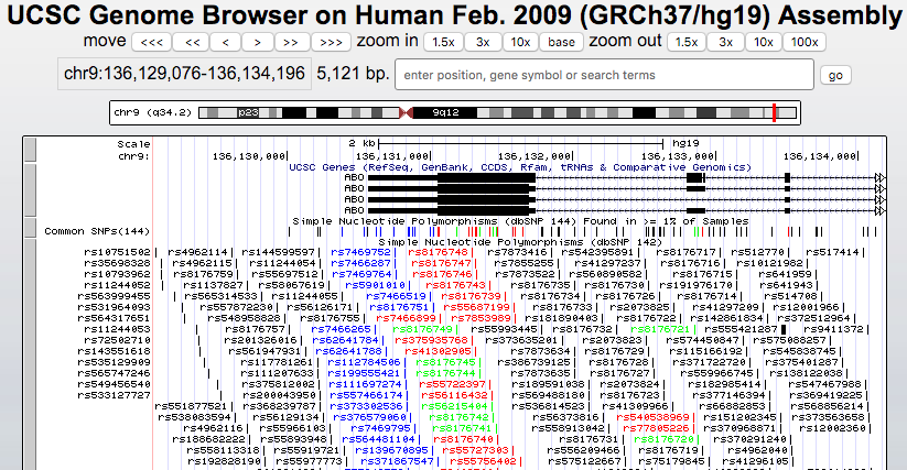 The above session helps illustrate how SNPs are color coded regarding whether they represent a nonsense, missense, or frameshift variation. These SNPs are around the ABO gene and represent blood group variation.
