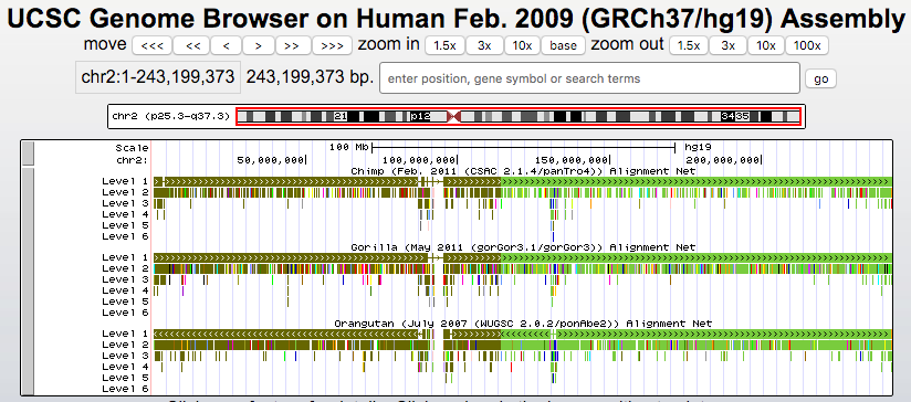 This session shows alignments of three species (Chimp, Gorilla, and Orangutan) against chr2 in hg19 and how the same sequences are found in two separate chromosomes in the other species.