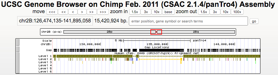 hg19 (chr2:126,645,017-138,651,416) coincide with the centromere in the Chimp chr2B: