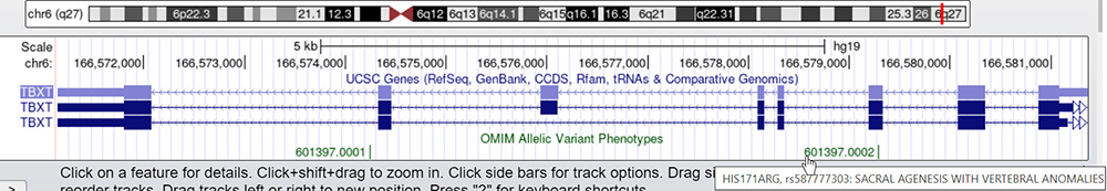 Turning on the "OMIM Allelic Variant Phenotypes" track confirms that mutations on this gene can have pathogenic effects. Figure 4 shows a mutation on exon 3 of TBXT that results in "sacral agenesis with vertebral anomalies," a condition where the sacral area of the spinal cord is underdeveloped, resulting in narrow skeletal and muscle morphology.