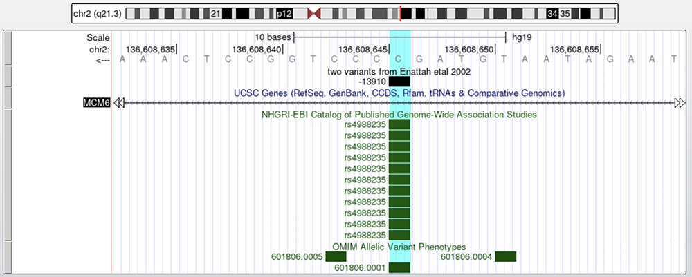 Figure 2a. MCM6 with two highlighted variants. A custom track labeled "two variants from Enattah etal 2002" show the coordinates, relative to the translation start of the LCT gene, of the variants in question. The "OMIM" and "GWAS" tracks are found below the "UCSC Genes" track, in respective order.